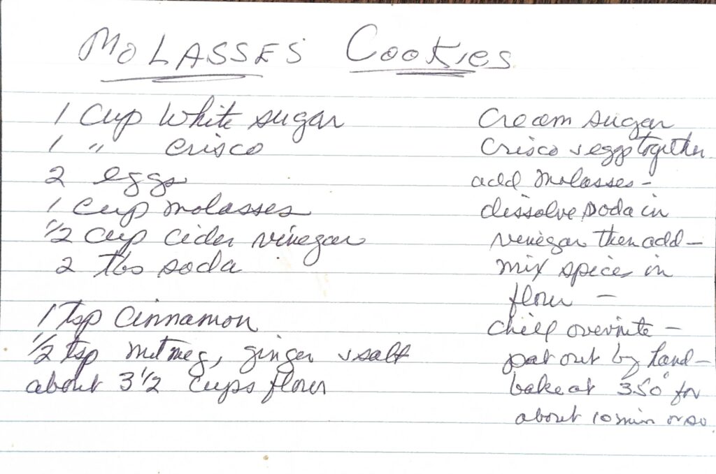 Cream sugar, Crisco, and eggs together. Add molasses. Dissolve baking soda in vinegar then add. Mix spices in flour and add to mix. Chill overnight. Pat cookies out by hand. Bake at 350° for about 10 minutes.