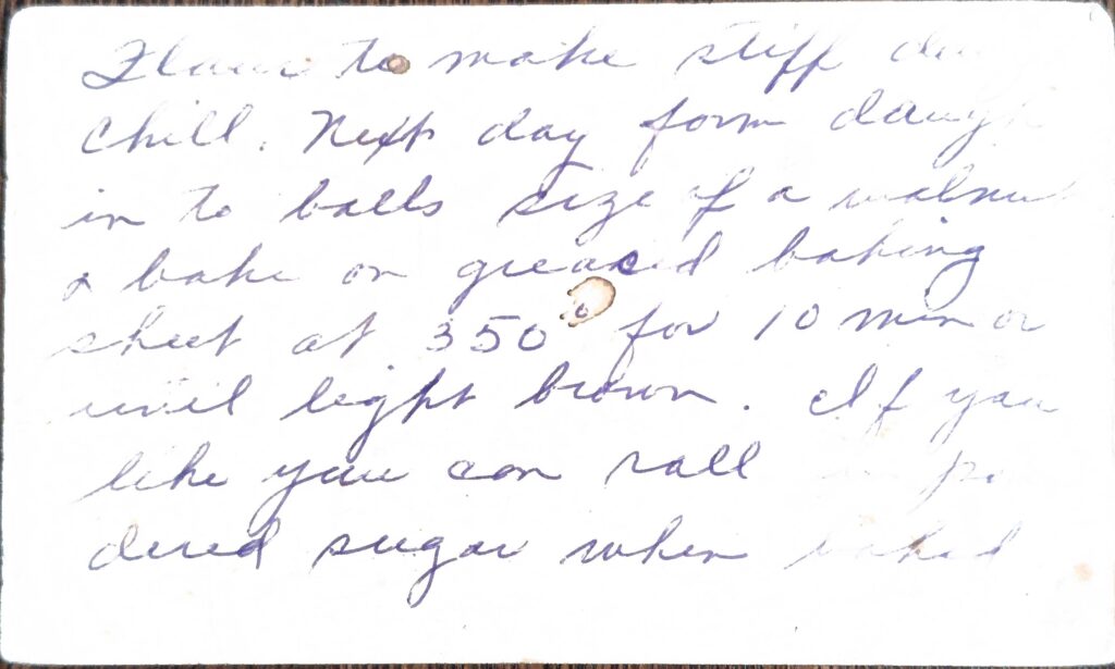 Mix all of the above with enough flour to make a stiff dough. Chill overnight. The next day, form the dough into balls the size of a walnut. Bake on a greased baking sheet at 350° for 10 minutes or until light brown. Can be rolled in powdered sugar after baked.